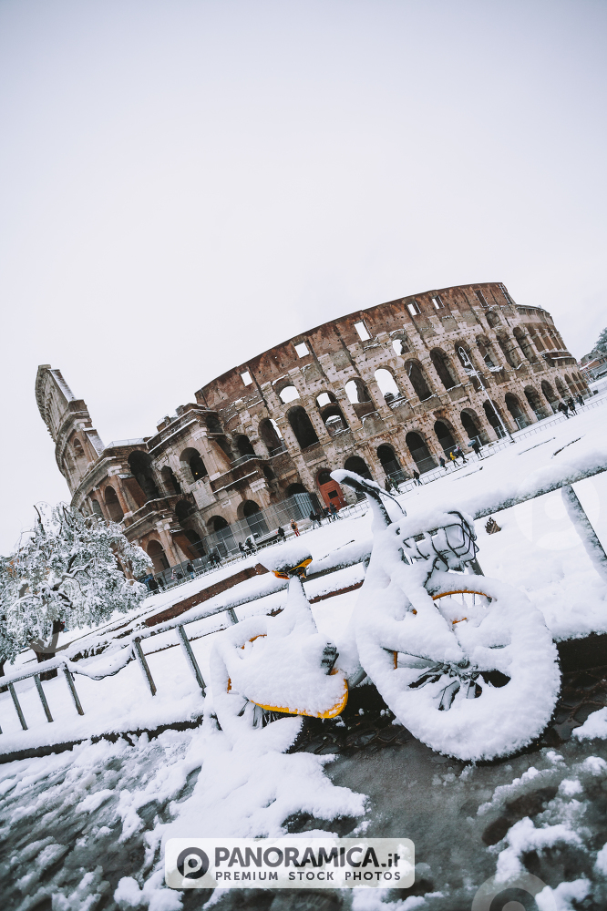 A lovely day of snow in Rome, Italy, 26th February 2018: a view of snowy bikes behind the Colosseum