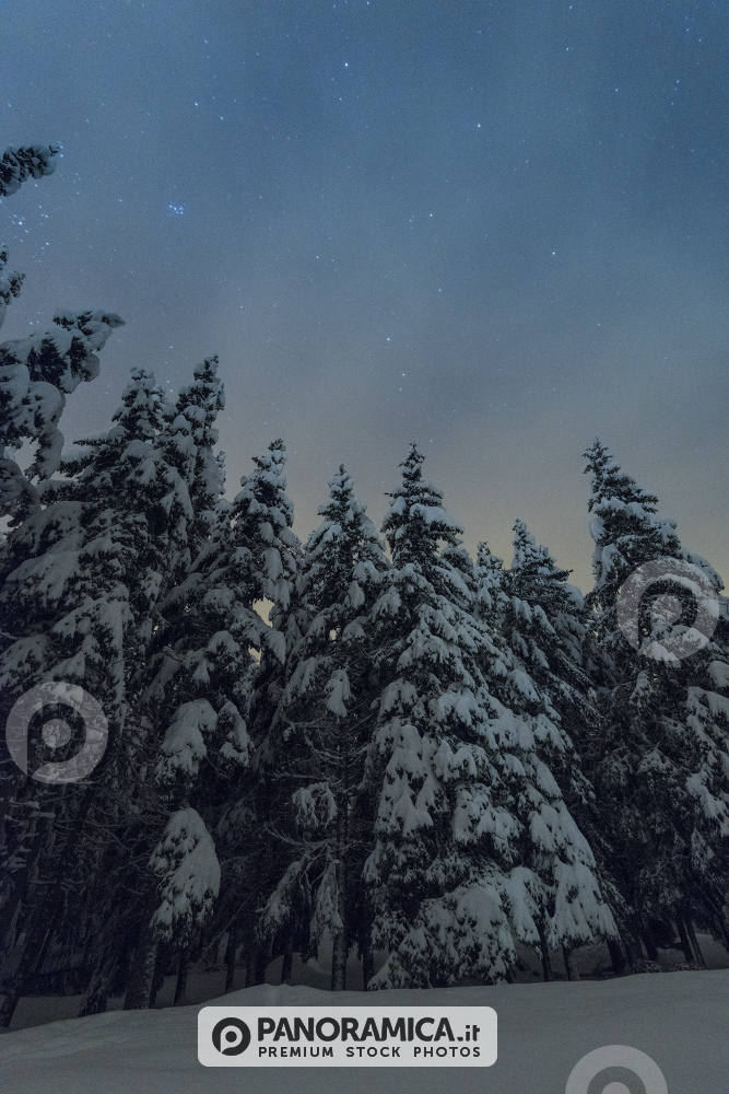 Abeti nel Bois de Pointy, dopo un abbondante nevicata, sotto un cielo stellato, a Plan Prorion, Valtournenche, Valle d'Aosta.