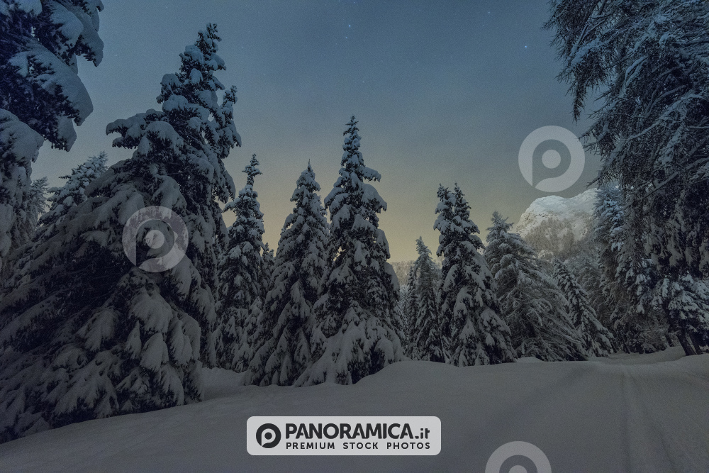 Abeti nel Bois de Pointy, dopo un abbondante nevicata, sotto un cielo stellato, a Plan Prorion, Valtournenche, Valle d'Aosta.