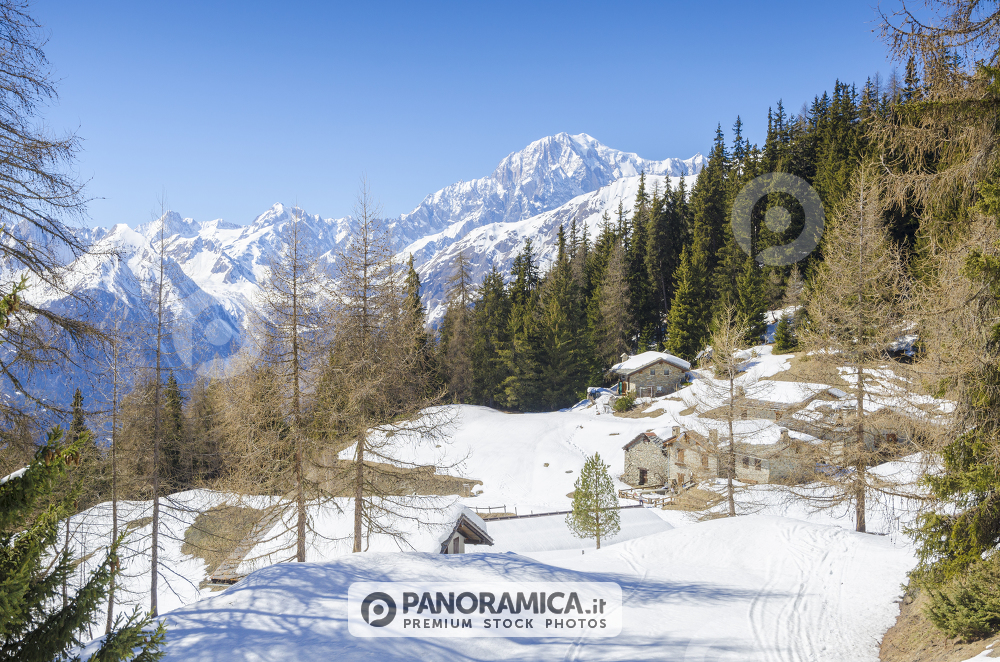 Il Monte Bianco sbuca dietro i boschi sopra l'Alpe Arpilles, La Salle, Valdigne, Valle d'Aosta.