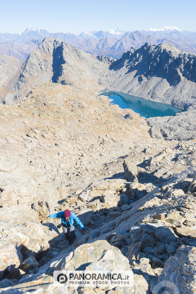 Alpinista sale i pietrosi pendii verso il Mont Colmet, con il Lago di Pietra Rossa e la vista sui "4000" della Valle d'Aosta.