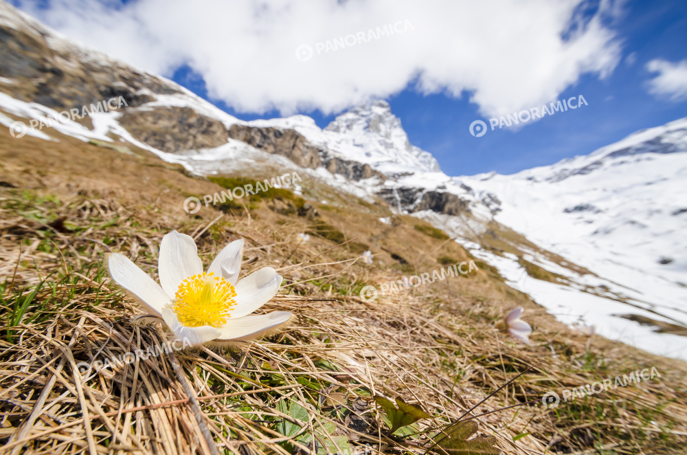 Lungo il sentiero per l'Oriondè, tra i pascoli ad inizio primavera, sbucano le anemoni di primavera (pulsatilla vernalis); dietro le creste sbuca la piramide del Cervino, Valtournenche, Valle d'Aosta.