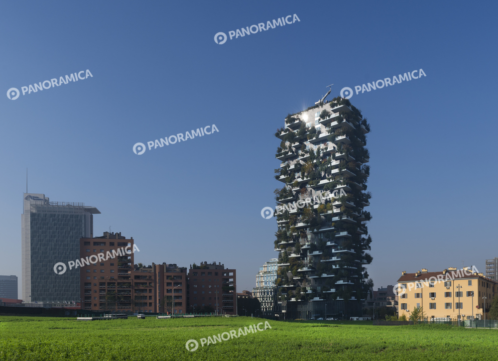 Bosco Verticale con cielo azzurro e verde del parco