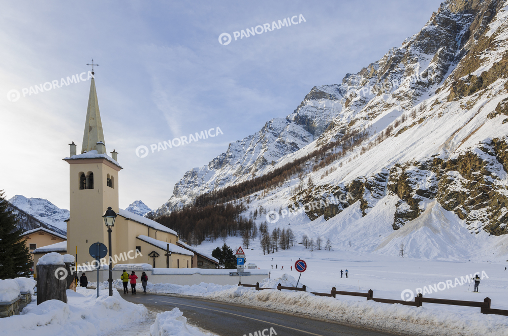 Le case di Bruil e la caratteristica chiesa di Rhêmes-Notre-Dame, Val di Rhêmes, Valle d'Aosta.