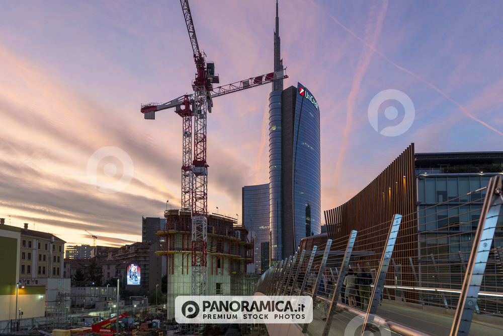 Cantiere della Torre Unipol e grattacielo Unicredit al tramonto