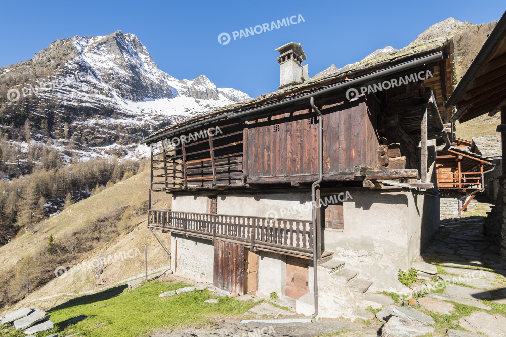 Una casa costruita in stile Walser lungo le viuzze di Alpenzù Grande, dietro cui sbuca la mole del Texel Horn.