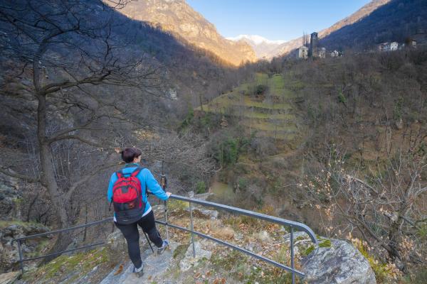 Un escursionista sul sentiero per il Pont Moretta, con la vista sui terrazzamenti e la torre di Tour d'Hereraz, Valle del Lys, Valle d'Aosta