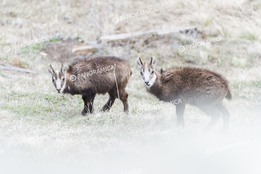 Giovani camosci brucano sui primi pascoli inverditi, in primavera, in Valnontey, Valle di Cogne.