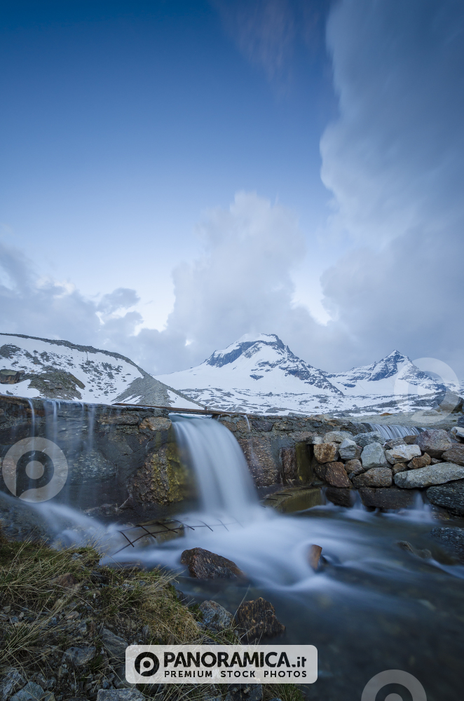 Scende la sera al Rifugio Vittorio Emanuele e all'adiacente piccolo laghetto di Moncorvè, dove una piccola cascatella guarda al Ciarforon e alla Becca di Monciair nella luce bassa, Valsavarenche, Parco Nazionale Gran Paradiso, Valle d'Aosta.