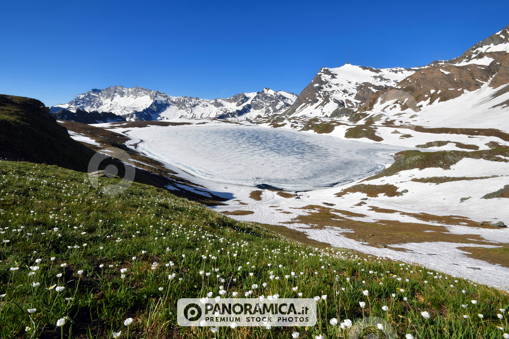 Lago Rossett ghiacciato (Nivolet) con prato fiorito, Gran Paradiso