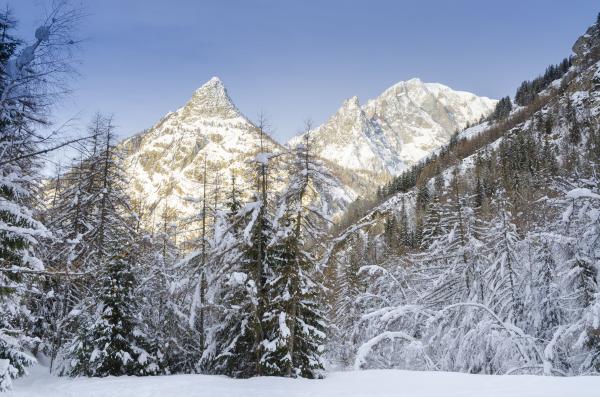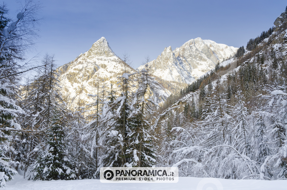 Il Mont Chetif, slanciato, ed il Monte Bianco appaiono sopra i boschi innevati della Val Sapin, Valle d'Aosta.