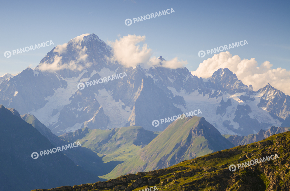 La luce del tardo pomeriggio abbraccia il massiccio del Monte Bianco, visto da poco sopra il Rifugio Deffeys. (Valle della Thuile, Valle d'Aosta)
