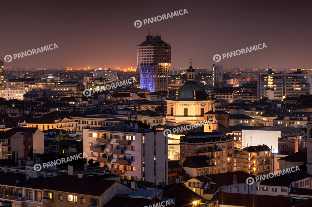 Panorama notturno con torre velasca illuminata di blu e la cupola di San Lorenzo alle colonne