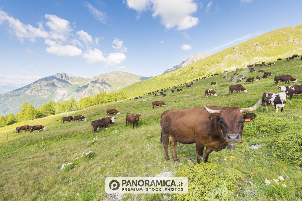 Vacche ai bellissimi pascoli dell'alpe Tza de Fontaney, Valle di Saint-Barthelemy, Valle d'Aosta.