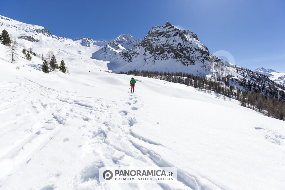 Ragazzo ciaspola nel vallone dell'Entrelor