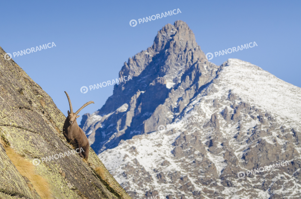 Uno stambecco ad inizio inverno si inerpica su ripide placche rocciose, stagliandosi di fronte alla mole del Gran Nomenon, in Valsavarenche, Parco Nazionale Gran Paradiso, Valle d'Aosta.