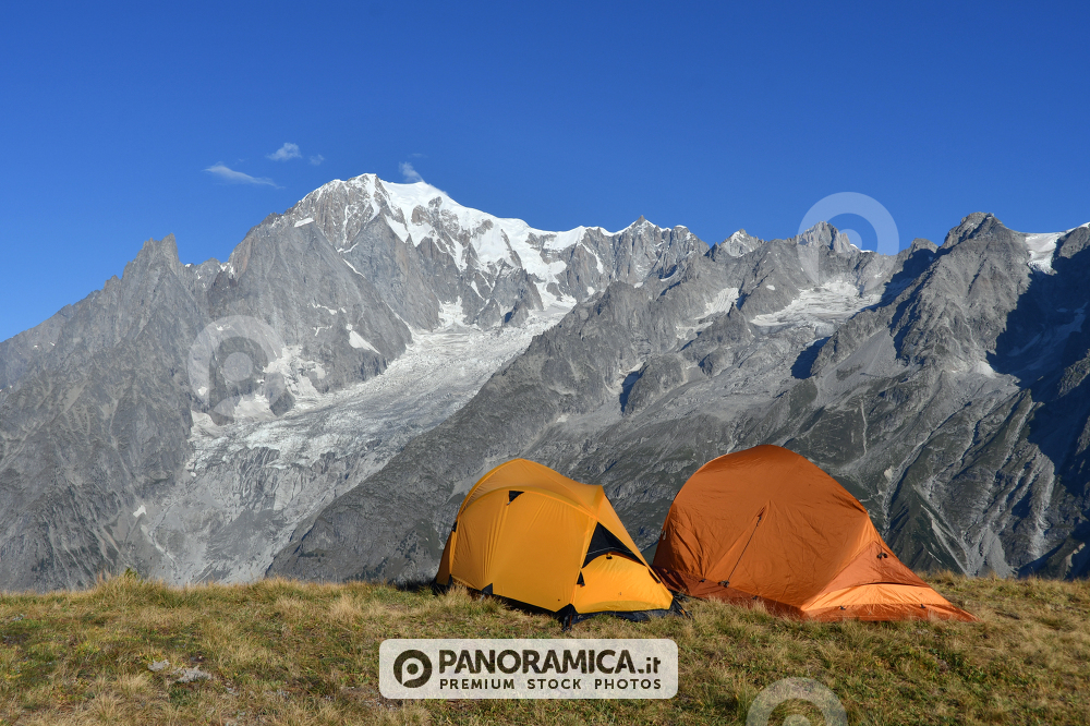 Tende con Monte Bianco e ghiacciaio delle Brenva sullo sfondo, Mont de La Saxe,val Ferret