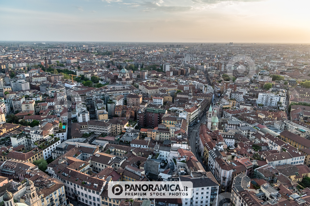 Veduta aerea Milano zona Via Torino, sulla destra si intravede via torino con il Civico Tempio di San Sebastiano, nella parte finale si intravedono le Colonne di San Lorenzo