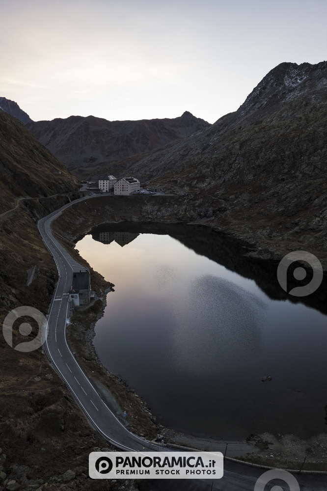 Vista aerea del lago al Colle del Gran San Bernardo all'alba