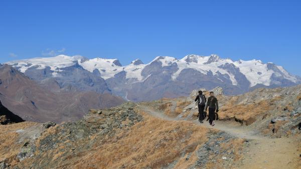 Escursionisti con ghiacciario di Verra sullo sfondo, Monte Rosa