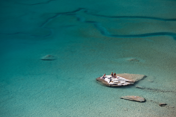 Tenda colorata di fronte ai ghiacciai del Monte Rosa