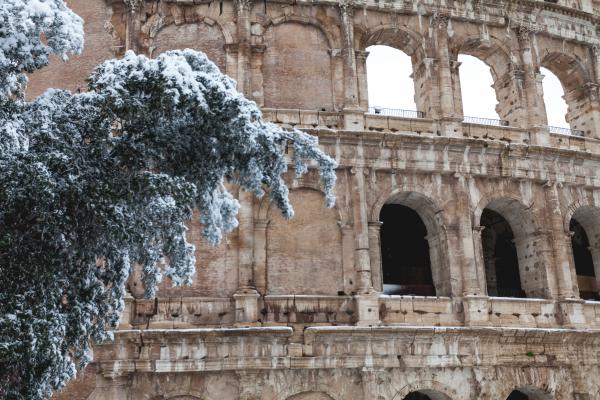 A lovely day of snow in Rome, Italy, 26th February 2018: a beautiful view of Colosseum under the snow