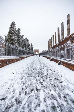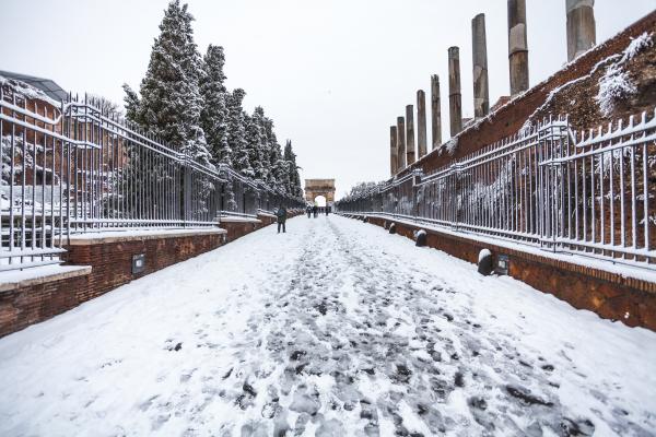 A lovely day of snow in Rome, Italy, 26th February 2018: a beautiful view of Via Sacra and Arch of Tito near Colosseum under the snow