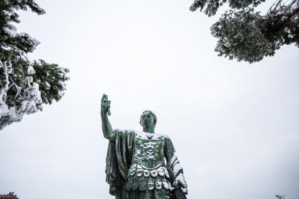 A lovely day of snow in Rome, Italy, 26th February 2018: a view of Statue of Nerva near the Colosseum under the snow