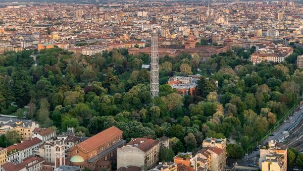 Veduta aerea della Triennale di Milano, Parco Sempione, Castello Sforzesco e Duomo