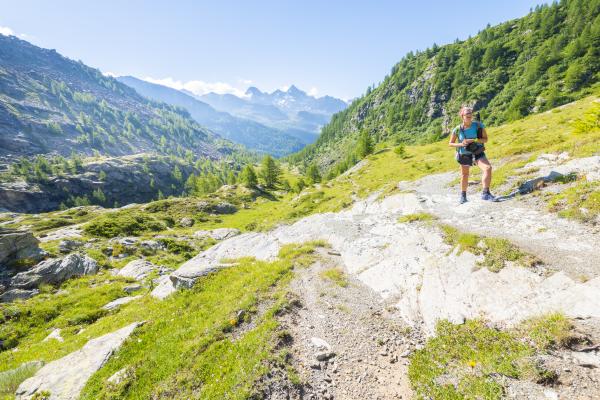 Escursionista nei pressi del Gran Lac de Tzere, Vallone delle Cime Bianche, Val d'Ayas, Valle d'Aosta, Italia